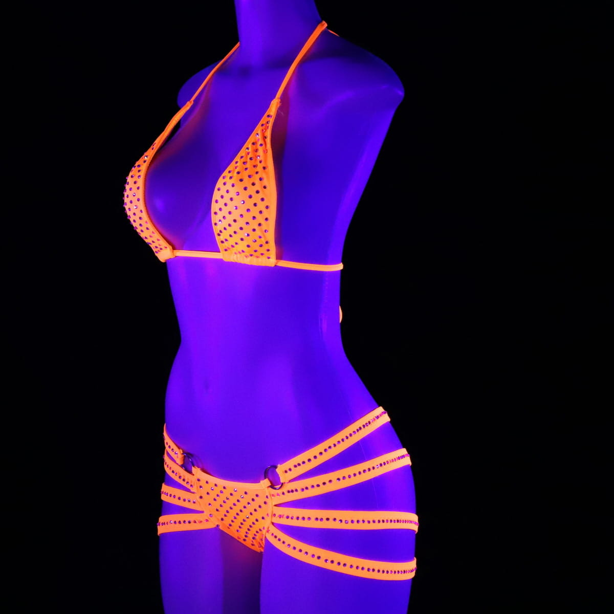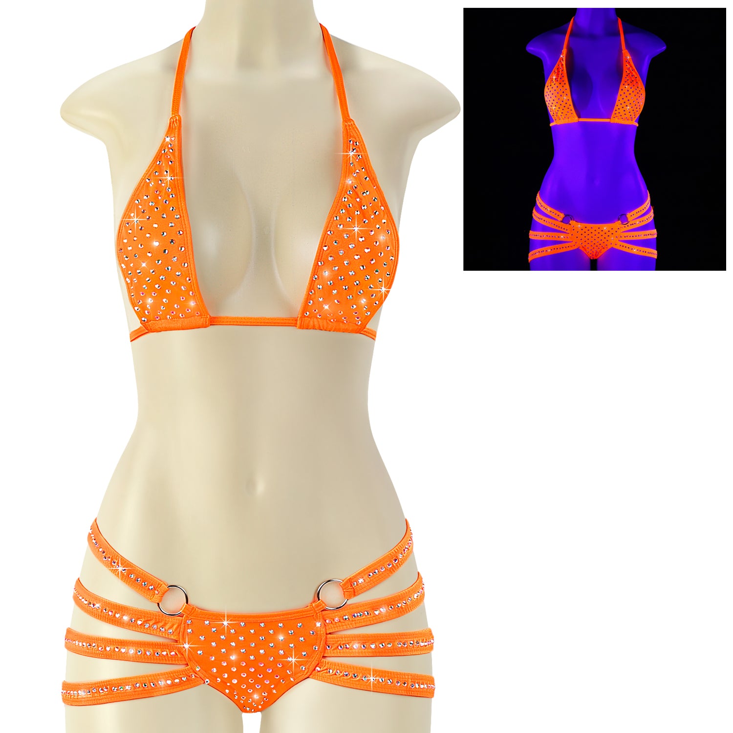 Rhinestone Embellished Two-Piece Dance Set, Crisscross Keyhole Halter Top, Multi-Strap Caged Panty, Fully Lined Nylon/Spandex Fabric